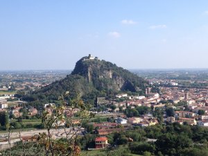 Monselice, se encuentra a los pies de un pequeño cerro llamado La Rocca, que en italiano significa castillo o fortaleza. De hecho sobre la colina se encuentra una antigua fortaleza que fue mandada a construir por el Emperador Federico II de Svevia en el ano 1239. El lugar escogido fueron los restos de una antigua fortaleza Bizantina y Lombarda. Para su construcción se demolió y reciclaron las piedras de una antigua iglesia que se encontraba en el lugar (la l’antica pieve di S. Giustina).