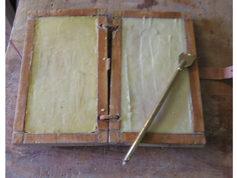 Otro modo común de escribir eran las llamadas tablas de cera, que consistían en delgadas tablillas de madera cubiertas con una capa de cera en las que se trazaban las letras con un estilete. Dos o más tabletas de cera podrían unirse y haciendo pequeños libros como se ve en un fresco del siglo I DC encontrado en Pompei y ahora en el museo nacional de Napoles.
