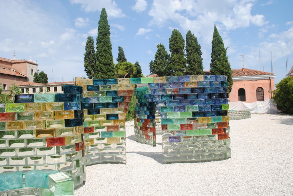 Glass de Pae white. Escultura hecha con ladrillos de vidrio de color.