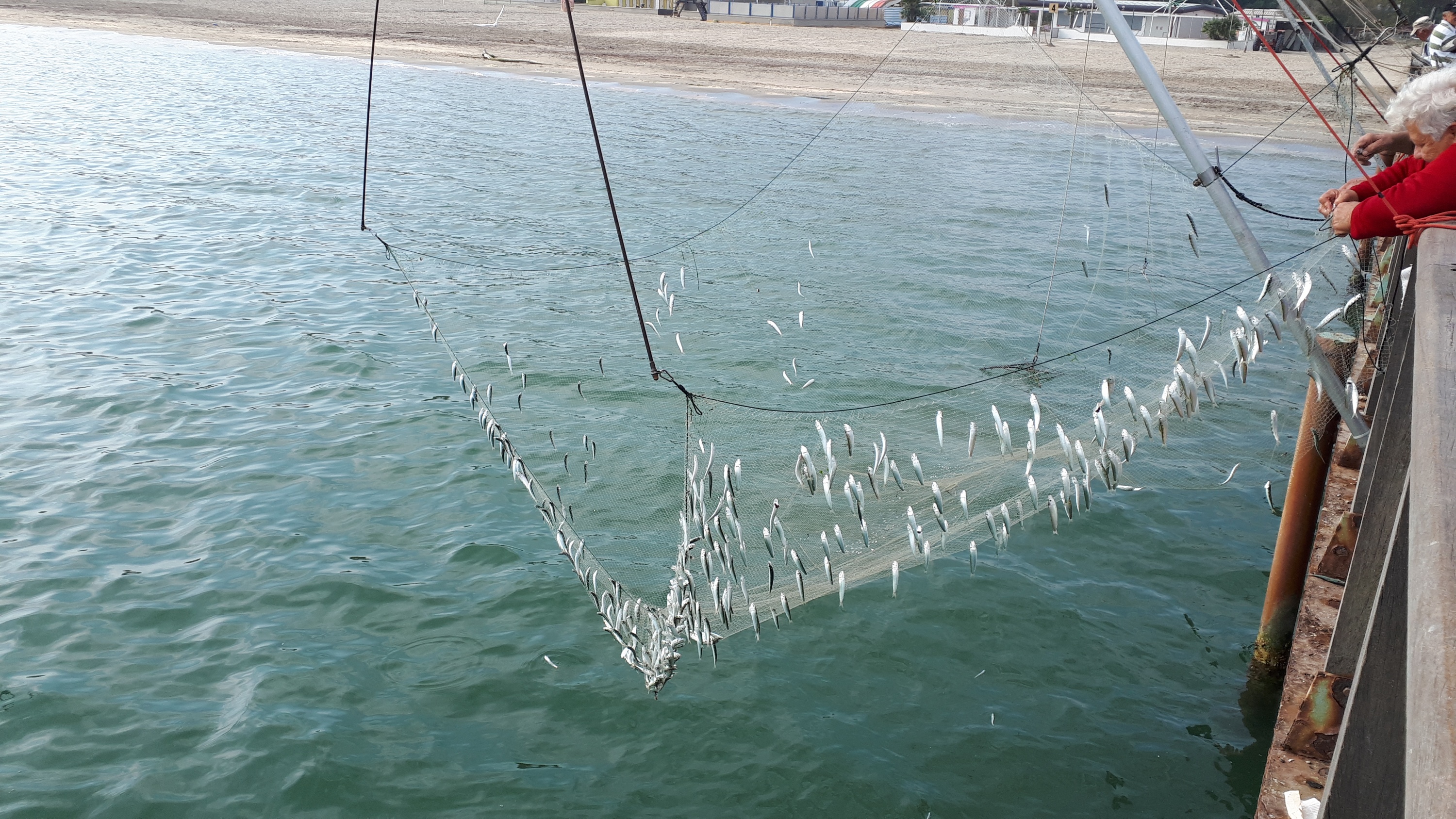 Los pescadores están sobre un muelle y con un tecle bajan una red cuadrada, la que después de estar por cerca de un minuto sumergida en el agua, se levanta y con este movimieto atrapa los peces que estén nadando sobre la red.