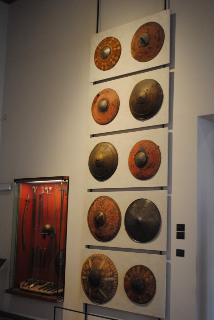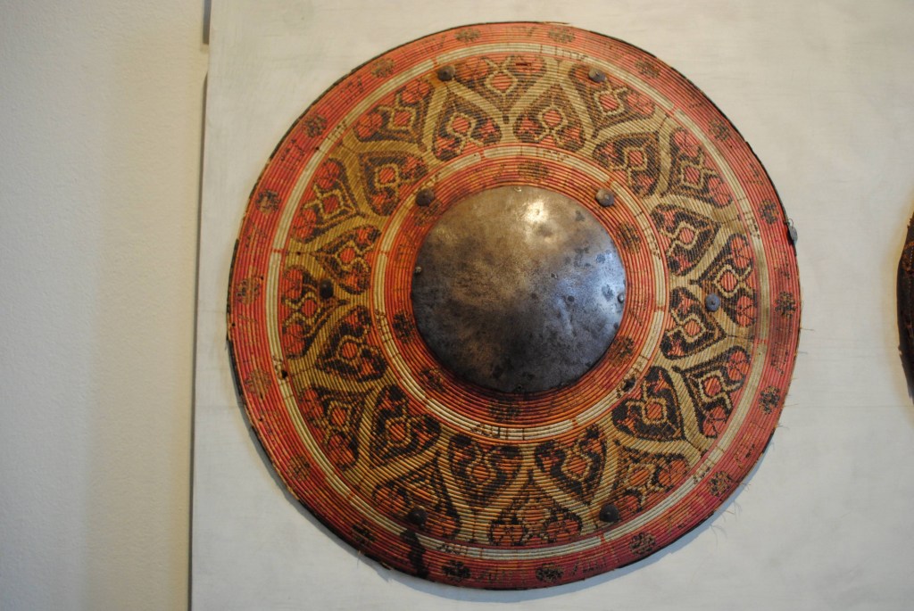 Visitando el museo Correr me encontre con una interesante colección de escudos decorados con una especie de bordado de bellisimos colores.