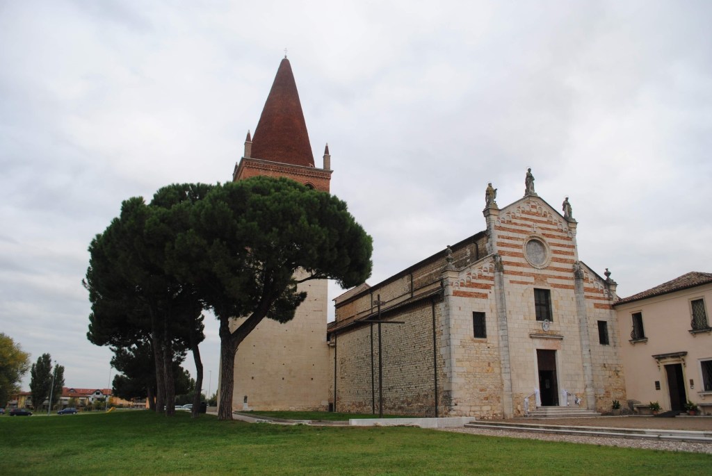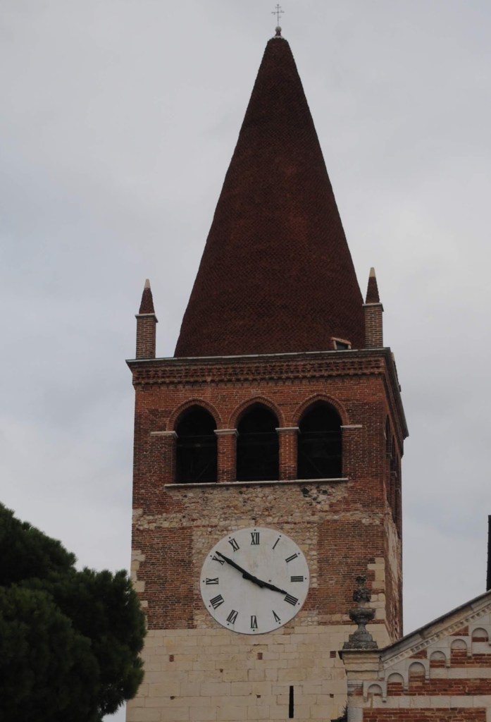 Un dia al salir de la autopista A4 a la altura de San Bonifacio me encontré delante a una iglesia con un campanil bastante particular.
