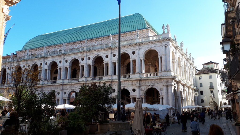 El edificio a nuestra derecha es la Basilica Palaldiana y a la izquierda del puente se puede entrever el perfil del Palazzo Chiericati. Ambos son famosos edificios diseñados por Andrea Palladio y que se encuentran en la ciudad de Vicenza.