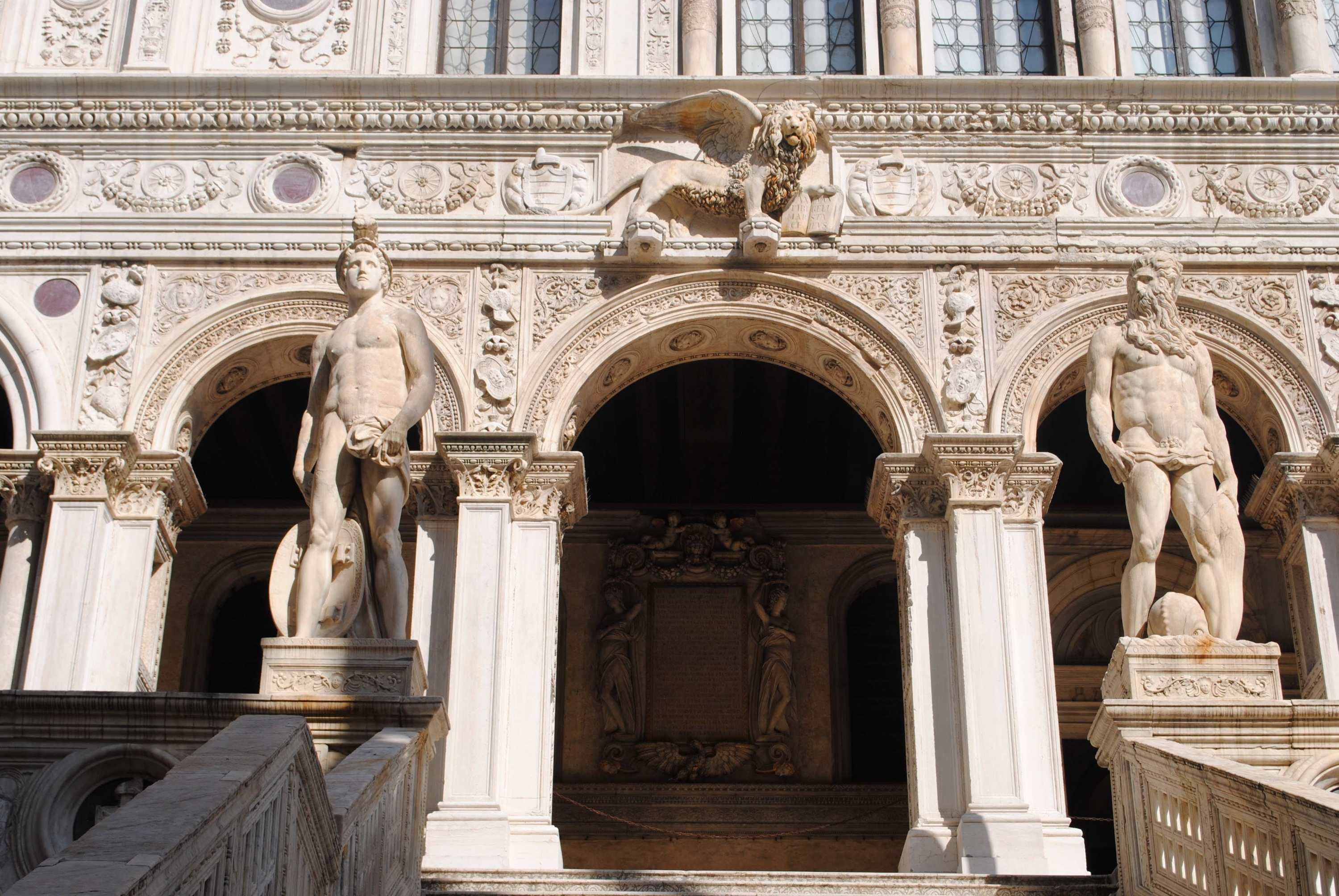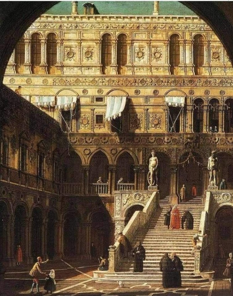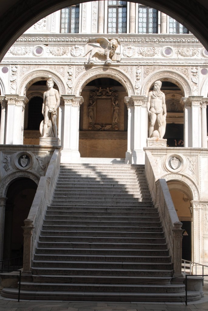 Para embellecer aún más este lugar, en 1566 se colocaron en lo alto de la escalera, dos enormes estatuas de Marte y Neptuno, realizadas por Jacopo Sansovino, que representaban el dominio de Venezia sobre el mar y la tierra.