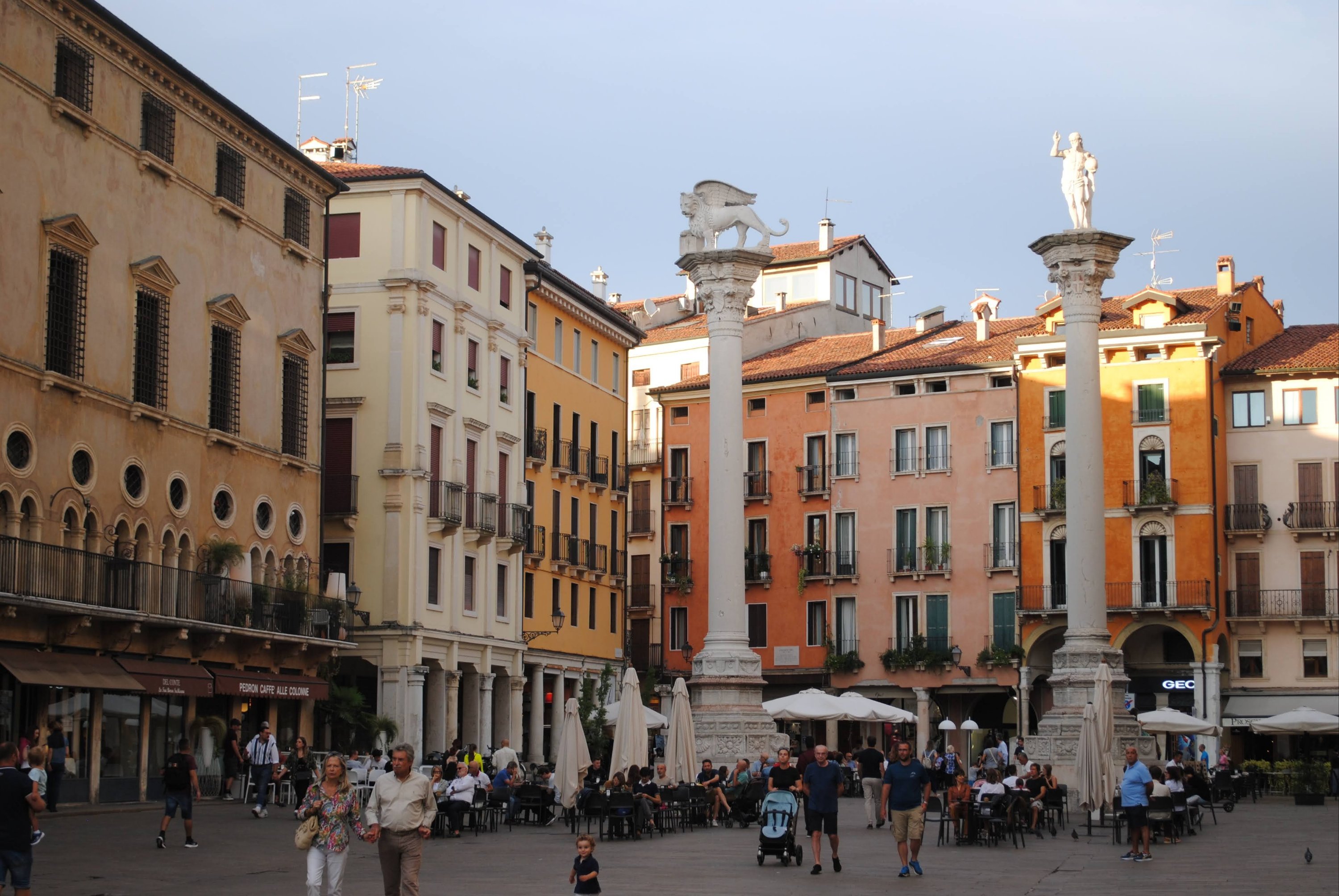 Sin duda, uno de mis ángulos favoritos de Vicenza es la parte oriental de la «piazza dei Signori» donde coloridos edificios hacen de fondo a las columnas del león de San Marco y de Cristo Redentore.
