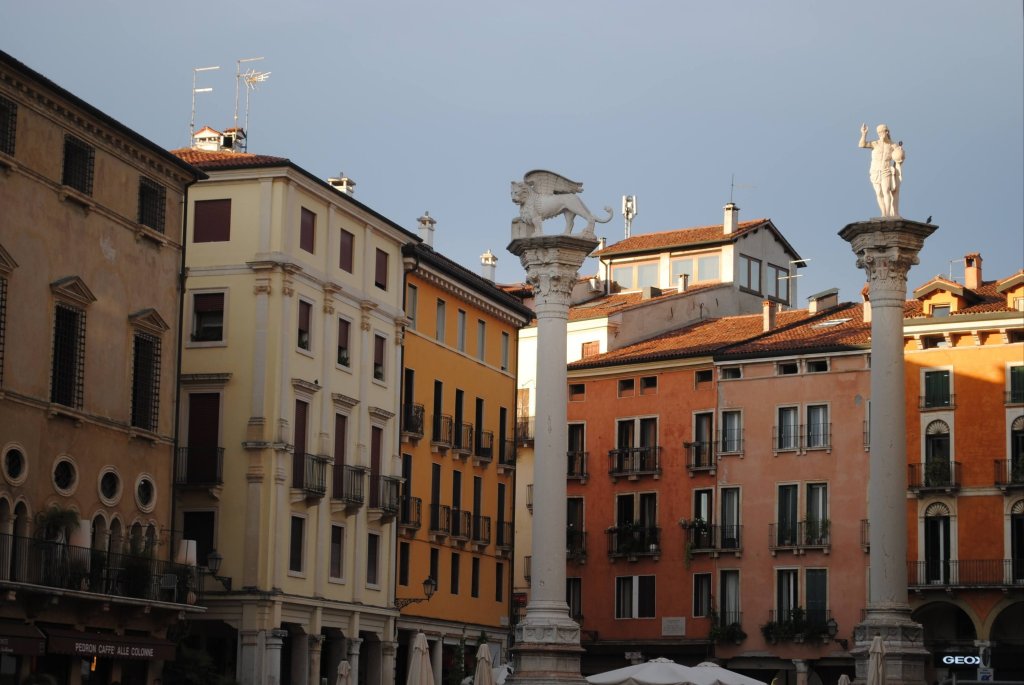 La República de Venezia solía instalar en algunas de sus principales ciudades columnas como las que hay en Vicenza, una con el leon alado, símbolo de la República y otra normalmente con el Santo patrono de la ciudad.