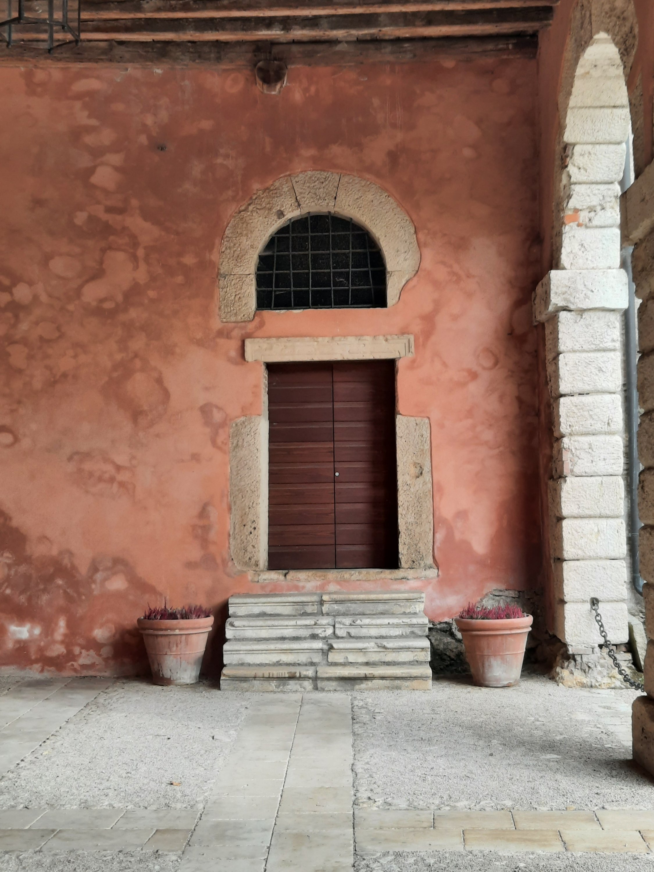 En este post quiero solo mostrarles un detalle de las barchesas, una puerta. Para llegar a ella hay que bajar una escalera que está cerca de la tienda de recuerdos (en dirección a los baños). Al llegar a la parte baja uno se encuentra con una gran columnata que termina en nuestra puerta.