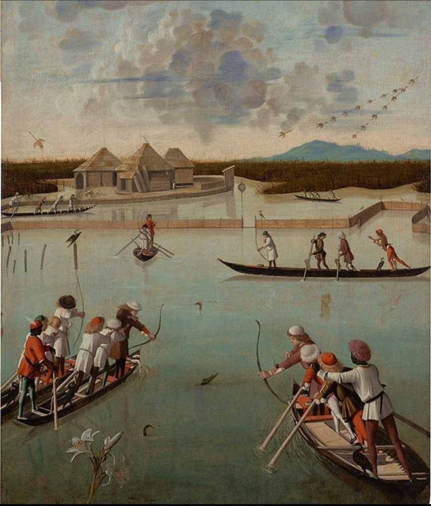 En un cuadro del gran pintor Vittore Carpaccio, podemos ver algunas barcas de fondo poco profundo con remeros se deslizan silenciosamente hacia un par de aves acuáticas a las que apuntan los arqueros. Estos no utilizan flechas, sino bolas de arcilla para aturdir a los animales y no dañar su plumaje. Un pájaro acaba de ser abatido por un arquero y ha caído al agua. Al fondo se ven más barcas, algunas cabañas cercadas por vallas, juncos y una montaña.