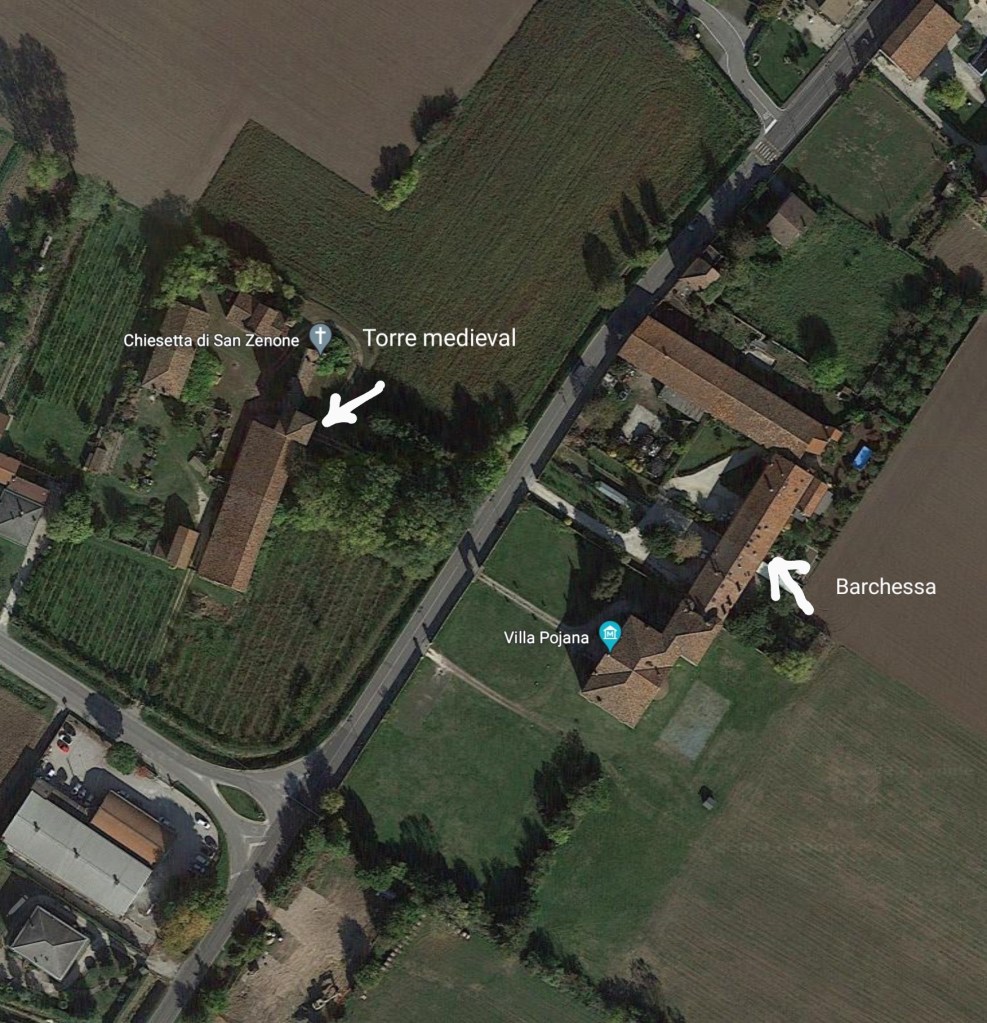 La villa fue construida en frente de una antigua propiedad de la familia que hasta el día de hoy es dominada por una torre y algunos viejos edificios de uso agrícola. Esto es lo único que resta del antiguo castillo medieval, cuyos restos con buena probabilidad fueron en parte utilizados para la construcción de la villa.