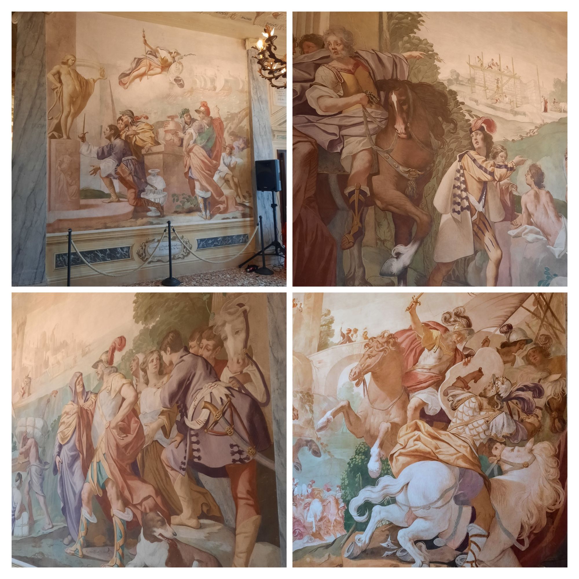 Al entrar a la villa se accede a la sala central en forma de cruz que presenta un rico ciclo de frescos pintados en 1650 por Luca Ferrari de Reggio. Las pinturas ilustran las Historias de Antenore, el mítico fundador de Padova;