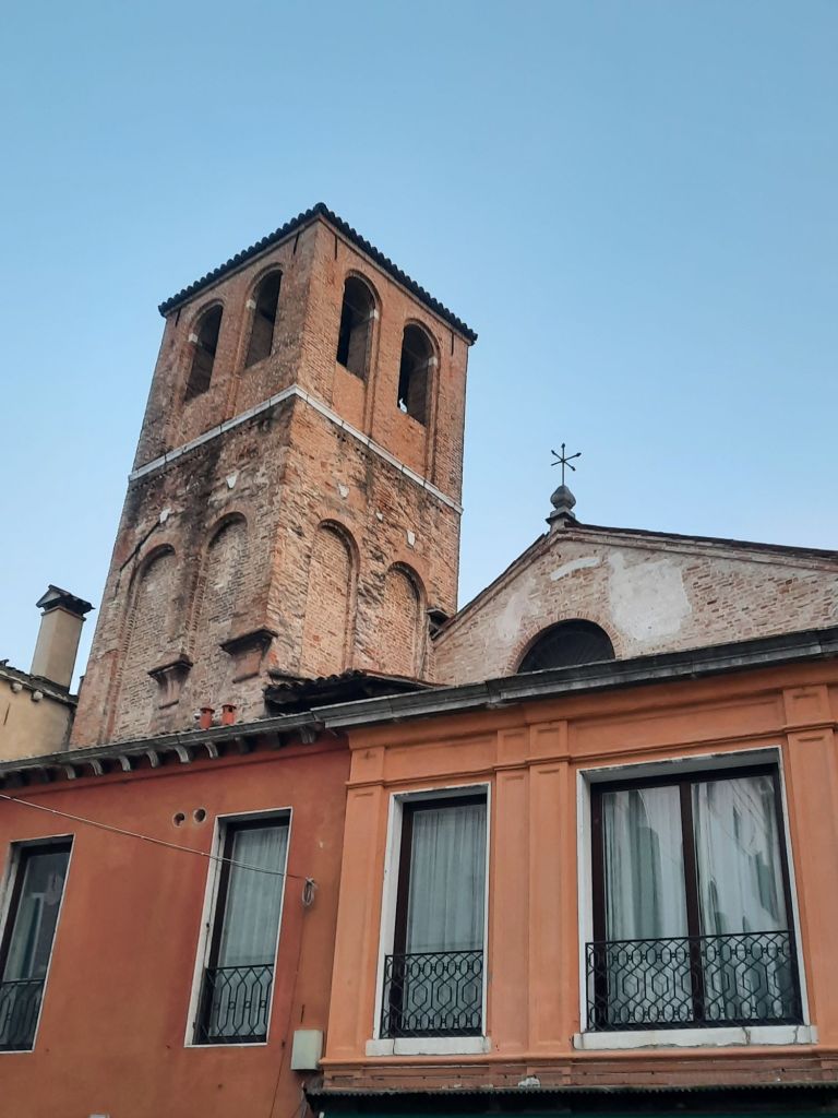 La iglesia de Santa Sofia no es una excepción a la regla, pero debido a diversas transformaciones que sufrió con el pasa del tiempo, hoy está completamente rodeada de casas, y si no fuera por que su campanil se asoma tímidamente entre los techos de estas, sería prácticamente invisible desde la calle.
