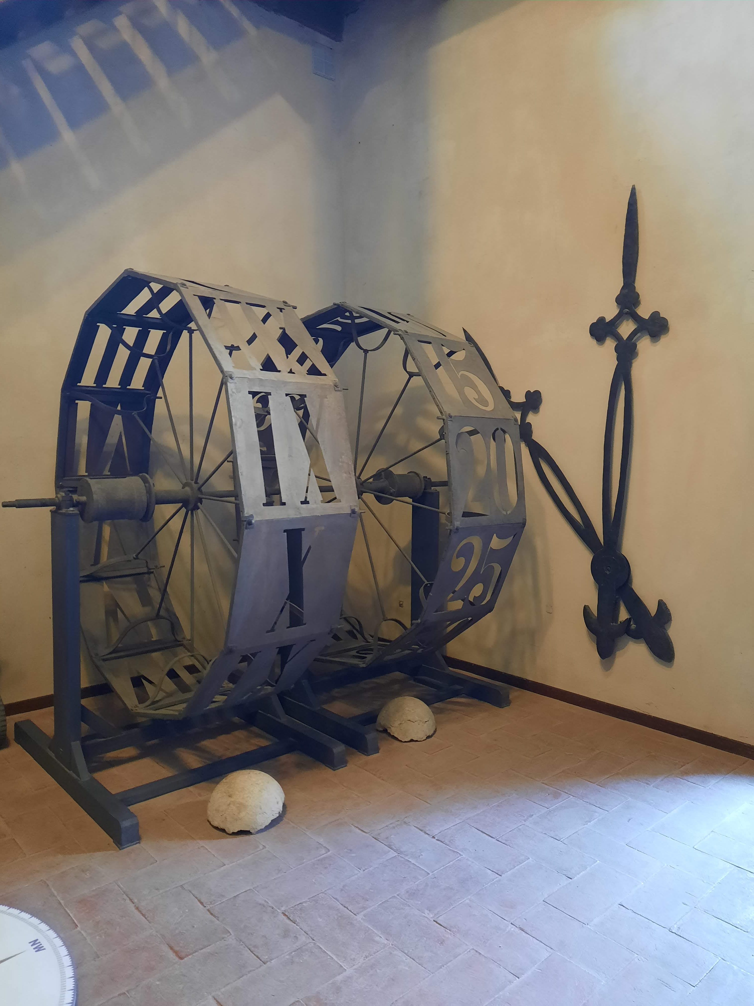 En la primera sala hay una exposición inicial de los objetos y engranajes que fueron sustituidos a lo largo del tiempo por quienes han realizado trabajos de restauración en el reloj. Es posible admirar la corona del siglo XV, las agujas, los signos zodiacales de cobre repujado, el péndulo de Fontana y también las dos estructuras del siglo XIX de madera y chapa tallada que girando detrás de las ventanas octogonales, permitían leer el reloj incluso de noche.