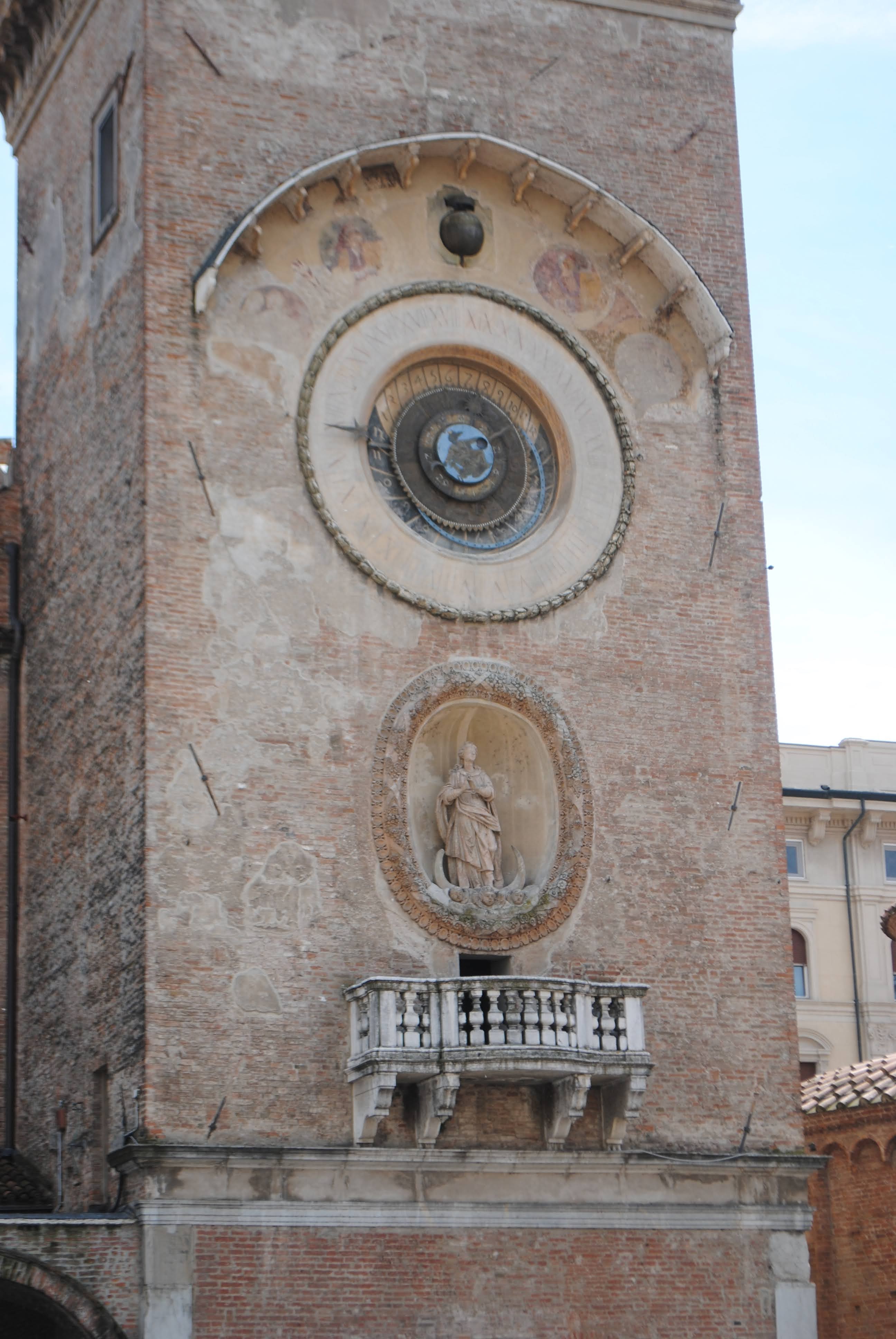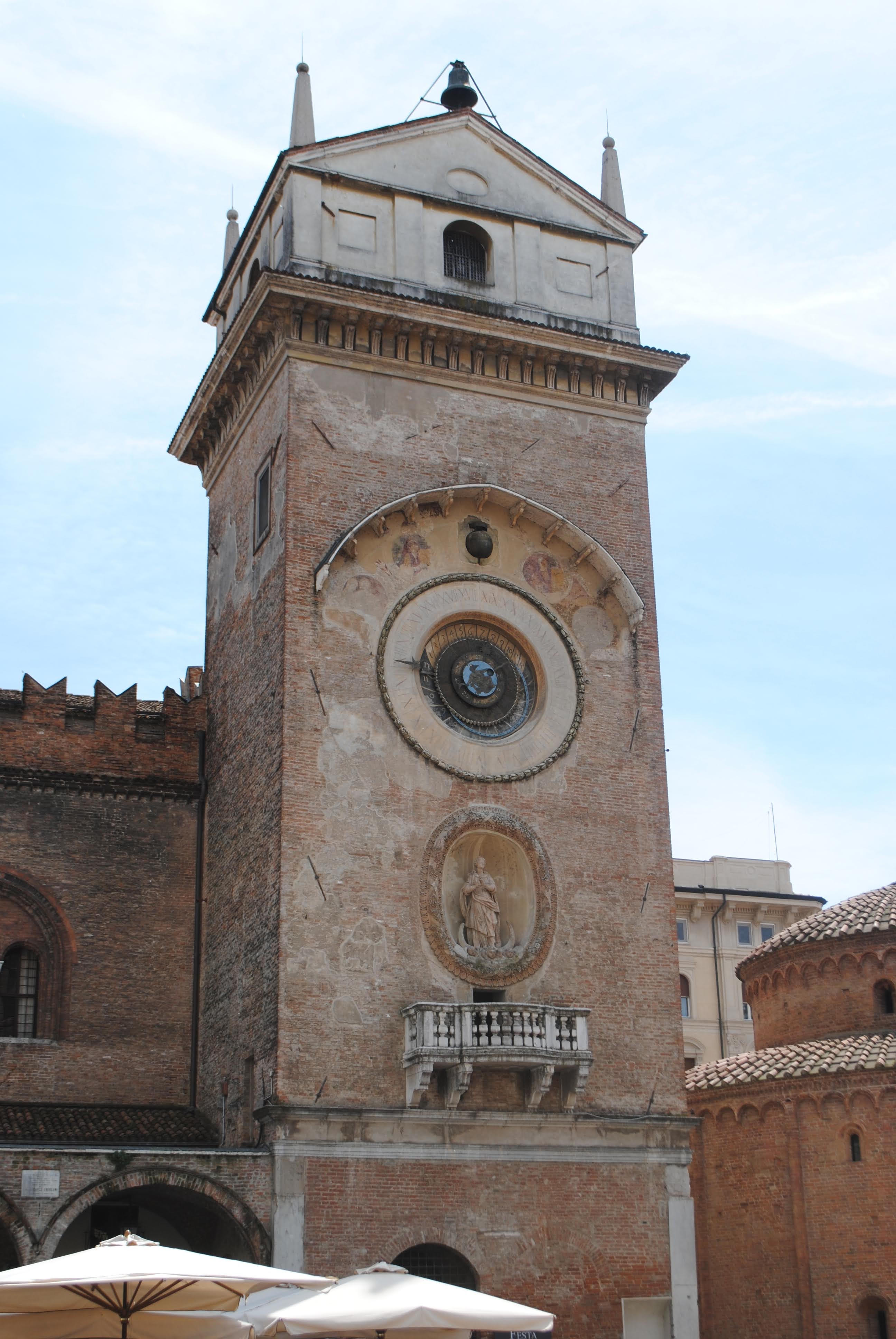 A finales de 1473 se colocó en la torre un reloj astronómico, obra del matemático mantovano Bartolomeo Manfredi, también conocido como Bartolomeo dell’Orologio.