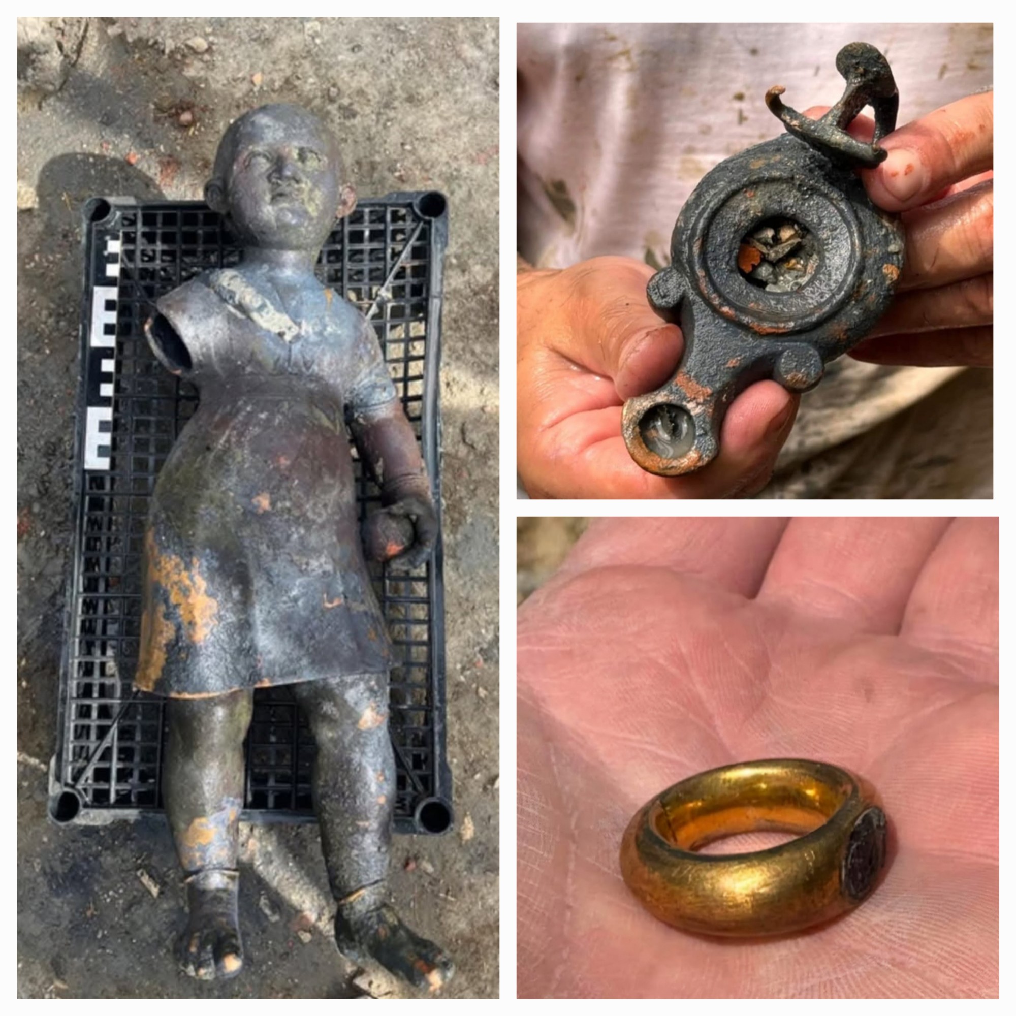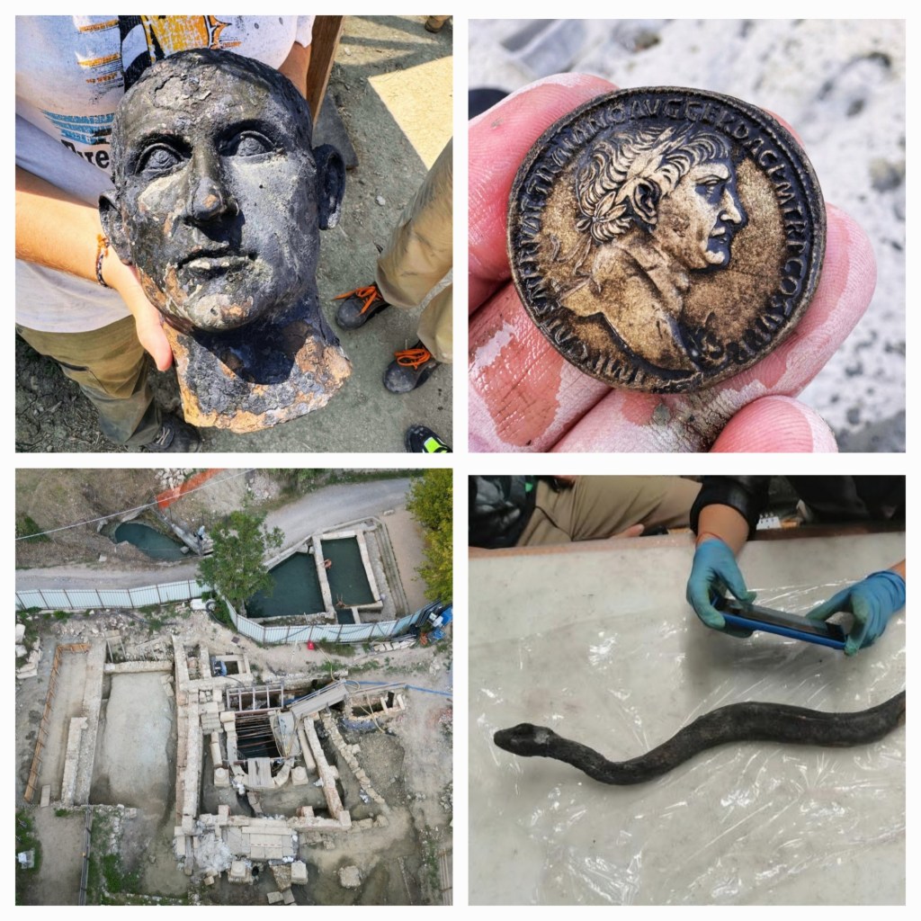 Una vez más, son las ofrendas de metales preciosos las que constituyen el elemento característico del depósito votivo. Cuatro nuevas estatuas y luego brazos, cabezas votivas y piernas inscritas, junto con instrumentos rituales, como una elegante lámpara de aceite, o un pequeño toro de bronce, que recuerda ese mundo agropastoral tan importante en este contexto y ya representado por el bajorrelieve del interior del estanque sagrado. Y también monedas de las épocas republicana e imperial, ya más de 10.000, halladas en el santuario de Bagno Grande. Pero junto al bronce, el hallazgo de una corona y un anillo de oro se asocia a la multiplicación de los oros romanos. Se trata de metales preciosos, incluidas gemas, ámbar y otras joyas, que vinculan el don de los poderes terapéuticos de las aguas calientes a las prácticas adivinatorias que, sin duda, debieron encontrar su foco en el santuario.