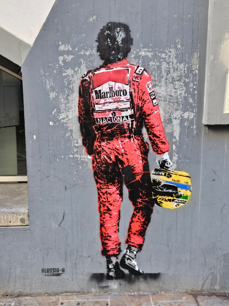 Una de las obras del artista Alessio B realizada por el 25° aniverio de la muerte de Ayton Senna.