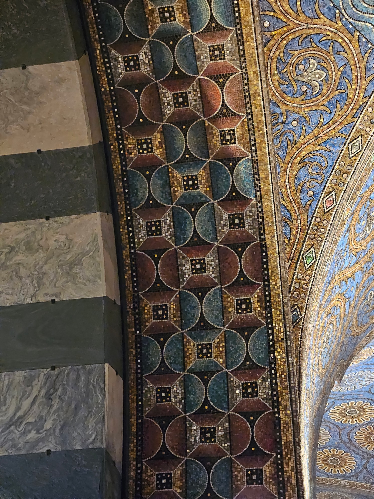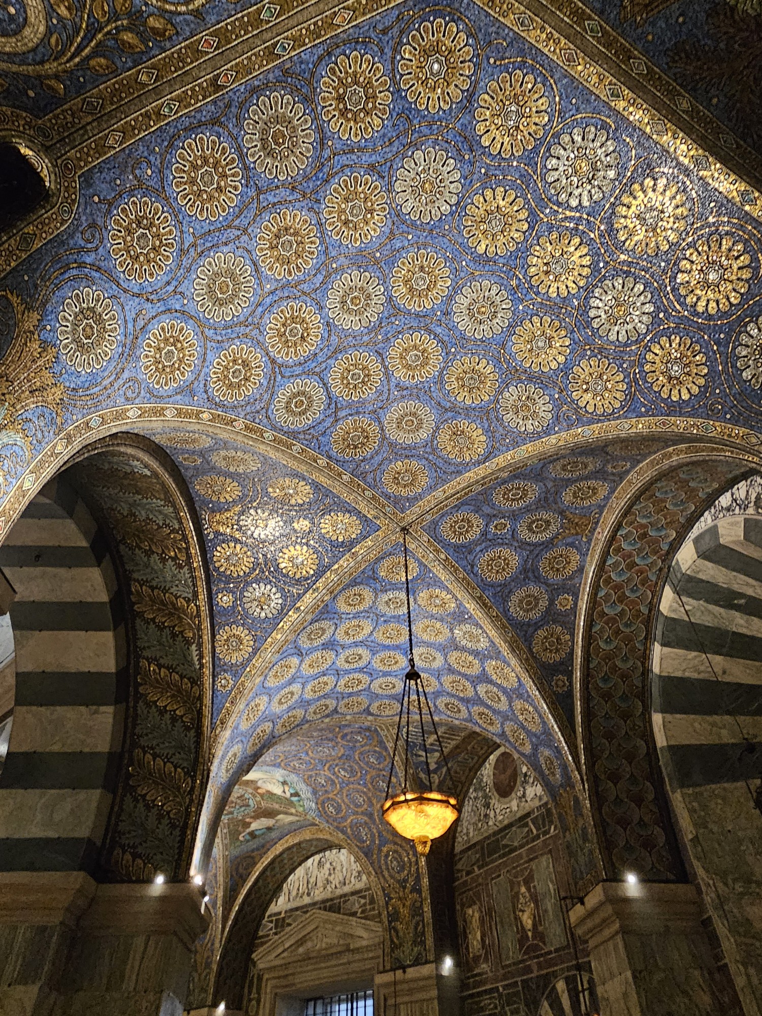 Cuando visité la capella hace un par de meses, quedé maravillado de su belleza y de la gran variedad e intensidad de sus colores, pensando que el mismo Carlomagno había participado a su diseño inspirado en los mosaicos que el mismo pudo admirar personalmente durante su estadía en Ravenna (Italia).