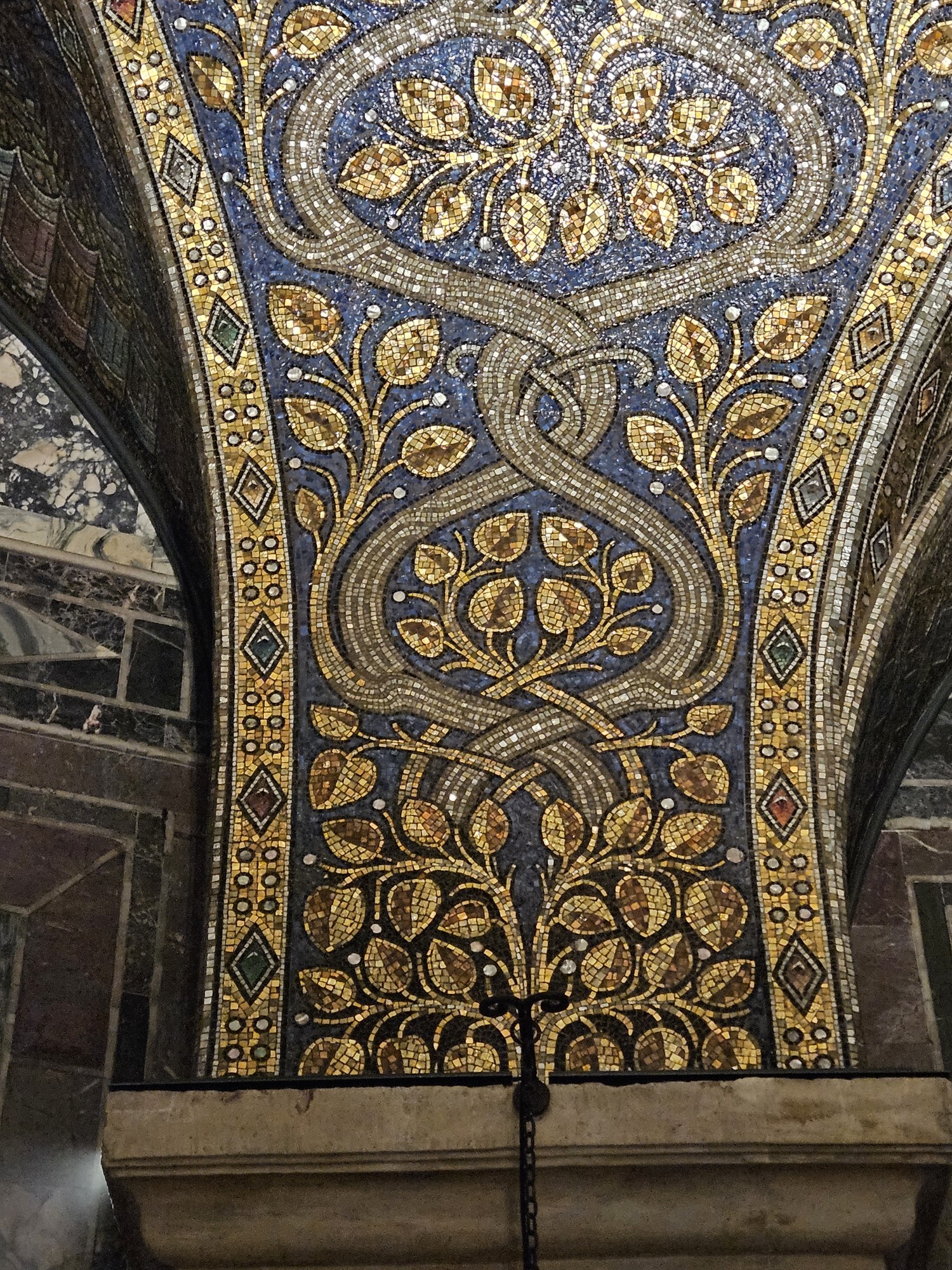 Sin embargo, cuando después de la visita investigue su historia, quedé un poco desilusionado ya que supe que la decoración original desapareció con el correr de los siglos, y que fue reemplazada en el siglo XIX por los mosaicos actuales.