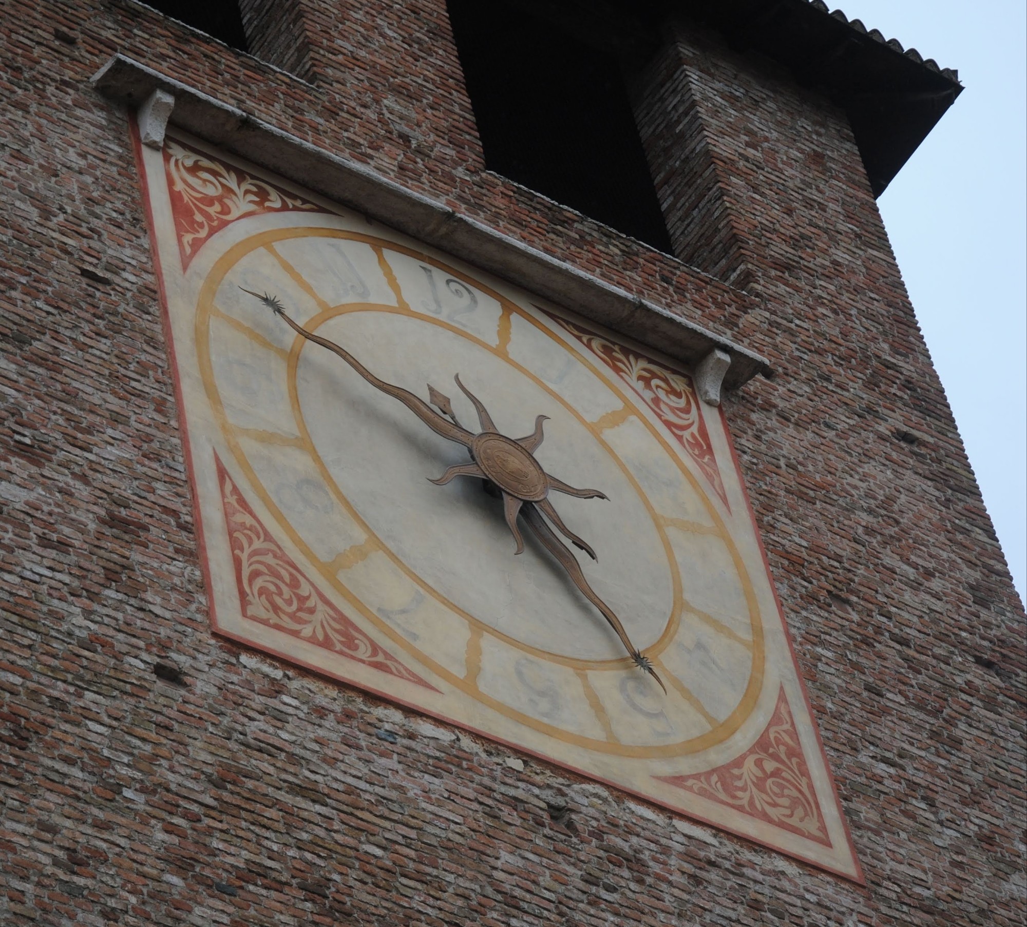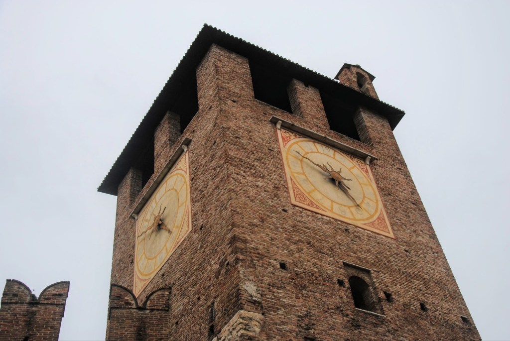 Castelvecchio en Verona es una fortaleza medieval construida entre 1354 y 1356 por Cangrande II della Scala. Sirvió como estructura defensiva y brevemente como residencia para la familia Della Scala. A lo largo de los siglos, sufrió varias transformaciones, una de las cuales es éste reloj, del que no he podido encontrar información.