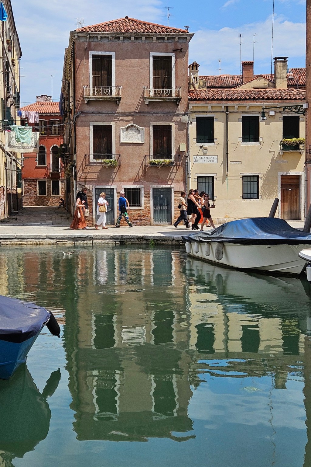Esta foto capta precisamente ese momento: la tranquilidad de un canal de aguas verdes, salpicado por el reflejo casi perfecto de las fachadas venecianas y pequeñas embarcaciones que descansan flotando tranquilamente.