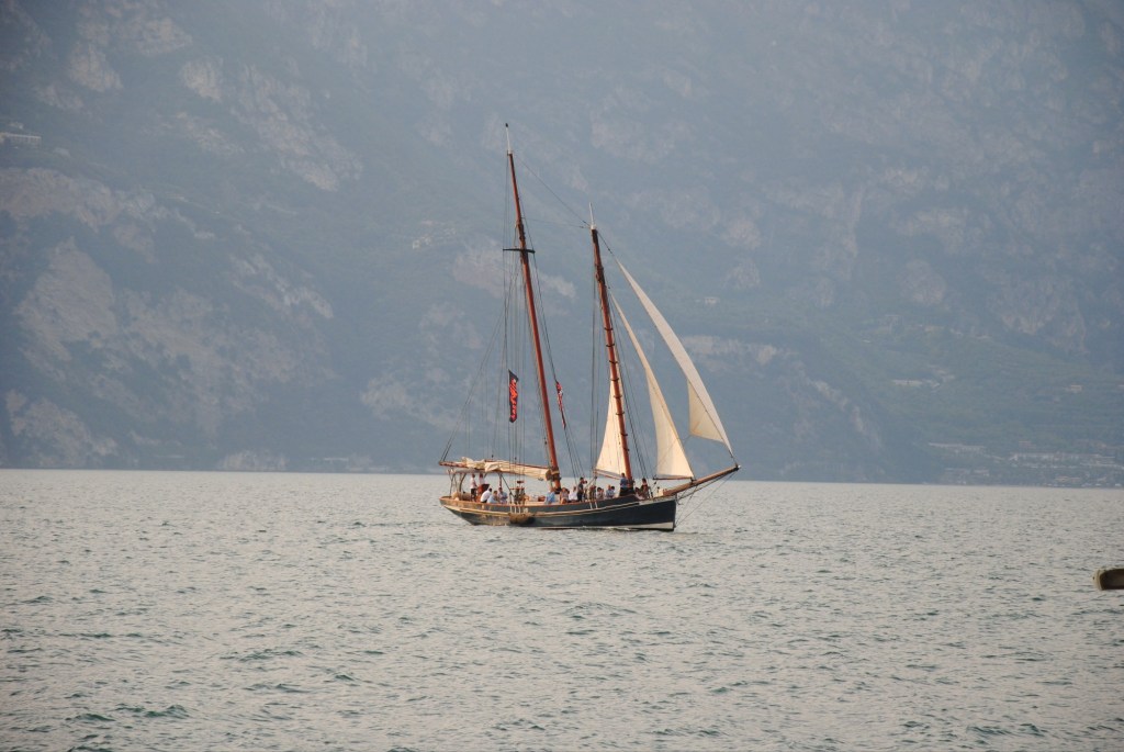 Cuando hace pocos días visitamos Malcesine, en su bellísimo puerto, encontramos este velero que al parecer realiza viajes turísticos en el lago di Garda. Al nuestro regreso lo encontramos otra vez, pero ahora navegando. Que espectáculo!!!