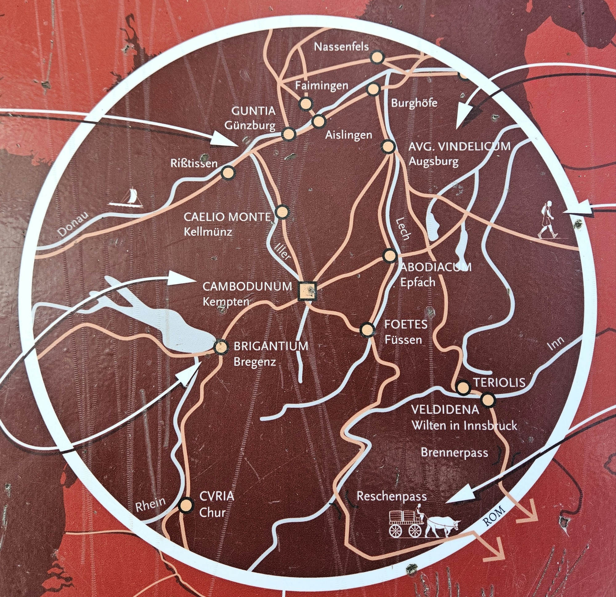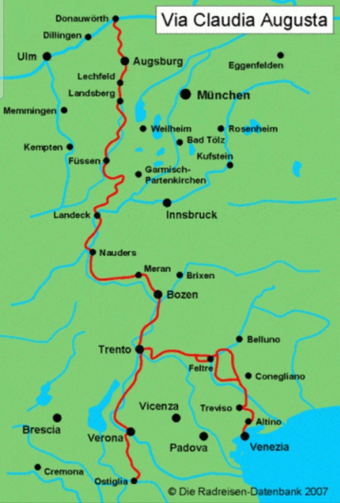 Esta antigua ciudad se encuentra en la región de la Raetia, en el cruce de la calzada romana que conducía desde la Galia hasta la provincia del Rin y la Via Claudia, que conducía desde Verona hasta el Danubio.