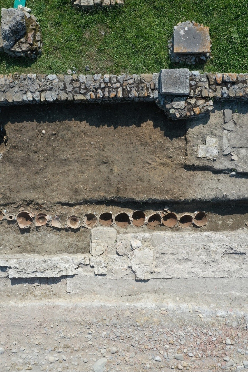 Además, la excavación clarificó la ocupación del área previa al complejo comercial principal, datando esta fase hacia finales del siglo I d.C. Se desenterraron numerosas ánforas que habrían servido para mejorar la estabilidad del terreno y probablemente estaban vinculadas a almacenes y al primer muelle fluvial de la ciudad, que entonces tenía un río mucho más amplio. Este hallazgo amplía nuestra comprensión del puerto, que era más extenso y activo en la zona sur de Aquileia.