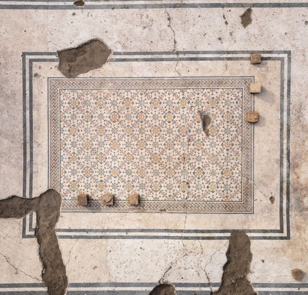 Despues de más de 60 años, el mosaico de la «alfombra floreada» , una de las expresiones más refinadas del arte mosaico de Aquileia, ha reaparecido durante las obras preliminares para la renovación del antiguo cuartel, que se convertirá en una residencia universitaria con 24 camas para estudiantes, profesores y académicos que participan en las excavaciones e investigaciones en el yacimiento de Aquileia.