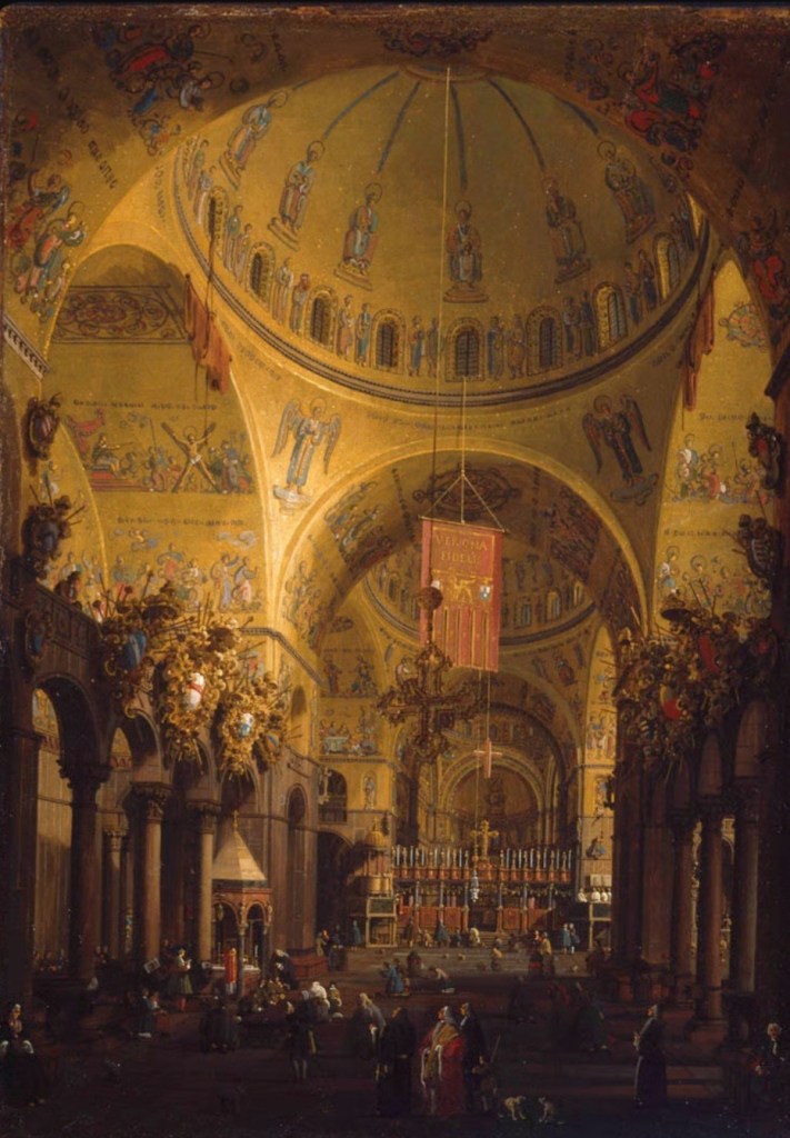 Canaletto es famoso por cuadros que nos muestran maravillosas vistas de distintos ángulos de Venezia. Sin embargo este es uno de sus pocos trabajos donde representa el interior de un edificio, y no podía ser otro que la Basílica de San Marco…