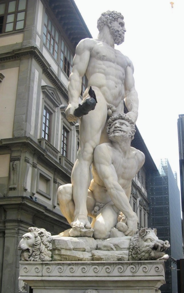 Esta escultura ubicada en la Piazza della Signoria de Florencia, frente al Palazzo Vecchio y junto a la réplica del David de Miguel Ángel representa a Ercole e Caco simbolizando el triunfo de bien sobre el mal.