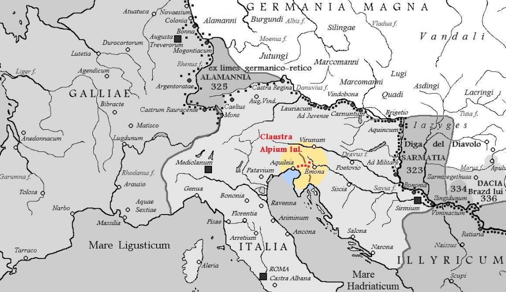 En el extremo meridional del sistema defensivo, donde los Alpes Julios descienden hasta el mar cerca de Duino (Trieste), se encontraba el punto de apoyo costero de la Claustra. Aquí, la defensa terrestre se combinaba con la vigilancia marítima del Golfo de Trieste, cerrando así cualquier posible ruta de entrada por el litoral adriático. Fue en esta zona donde tuvo lugar en 394 d.C. la famosa Batalla del Río Frígido, uno de los enfrentamientos militares más importantes de la historia tardorromana, en la que el emperador Teodosio derroto al usurpador Eugenio, consolidando la unidad del Imperio y el triunfo del cristianismo sobre los últimos reductos del paganismo oficial.