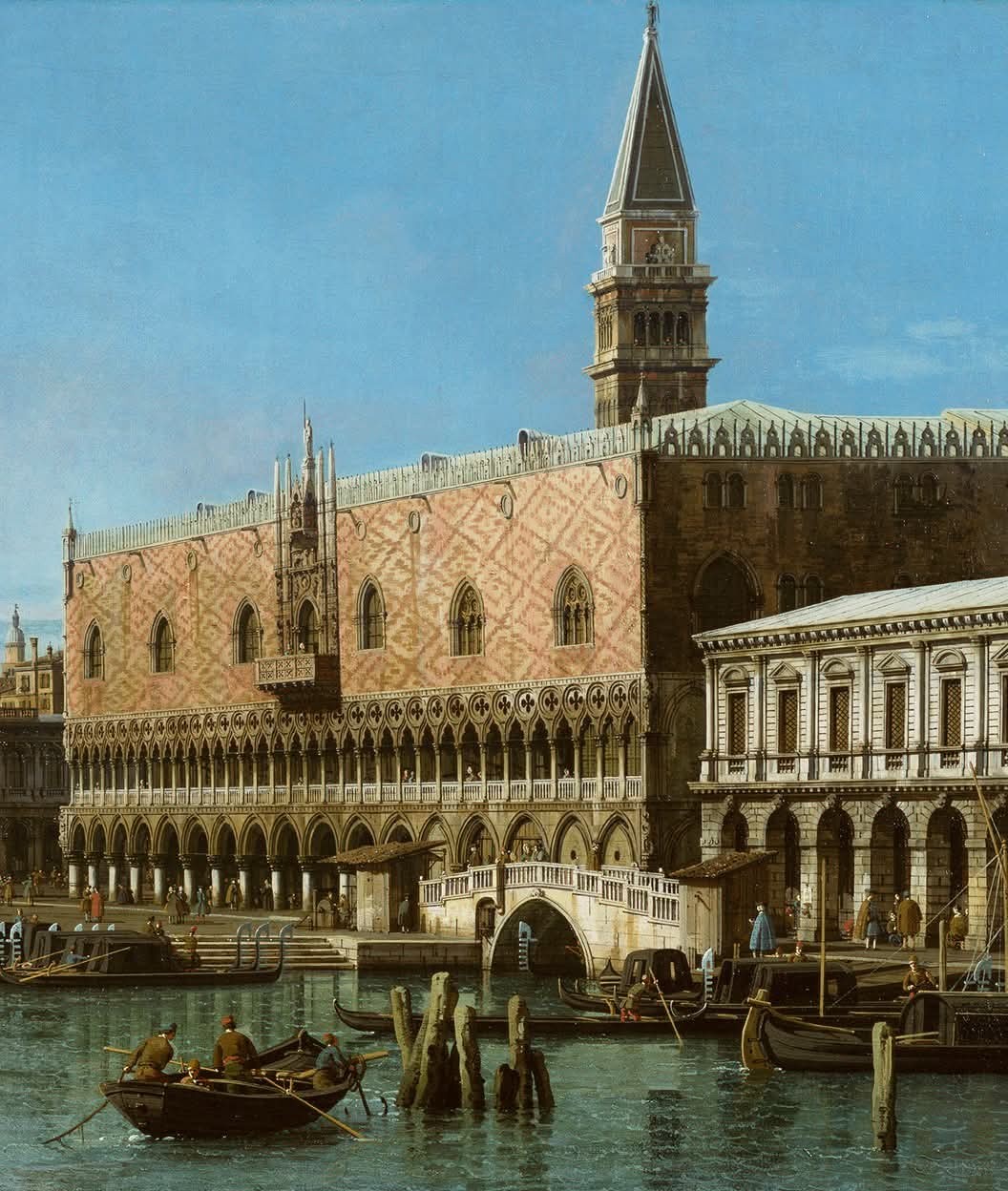 Lo sguardo dell’osservatore e attirato immediatamente verso il Palazzo Ducale, il cuore del potere della Repubblica di Venezia. Con la sua facciata in marmo bianco e rosa in motivo a rombi, un capolavoro del gotico veneziano del XIV e XV secolo, il palazzo domina la composizione con autorita solenne. Alle sue spalle si erge il profilo tagliente del Campanile di San Marco, ago di pietra che punta verso un cielo di cobalto impeccabile.
